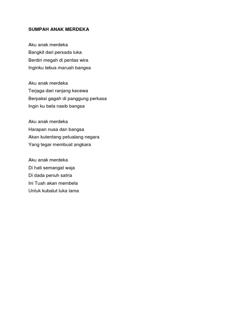 Sumpah anak merdeka aku anak merdeka bangkit dari persada luka berdiri megah di pentas. Sajak merdeka pendek sajak merdeka sumpah. "aku anak merdeka" sajak kemerdekaan. Aku anak bertuah tidak pernah mengundi